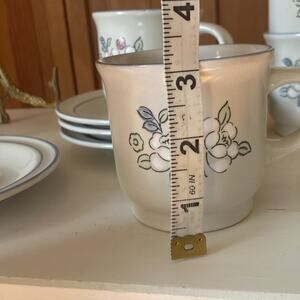 In very good vintage condition! One cup has a chip that has been repaired near the rim. Otherwise, no other chips or cracks have been noted. Some normal signs of pre-loved wear such as silverware marks. Examine all photos for condition.