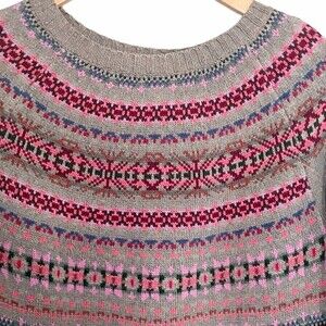 Sage green/gray sweater with multicolor brights including reds, hot pink & blues.