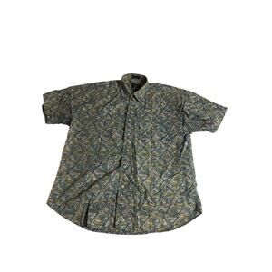 Looking for a unique vintage piece? This Chaps shirt is a must-have! It features a distinctive geometric pattern in shades of blue, green, yellow, gray. The short sleeves and lightweight fabric make it perfect for warmer weather.