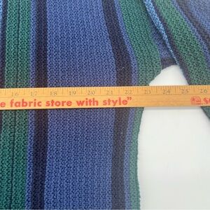 This vintage Chaps Ralph Lauren sweater features a bold striped knit pattern in shades of blue and green. Made in the USA from 100% cotton, it has a classic 90s aesthetic with a chunky knit texture, making it a great addition to any vintage or casual wardrobe.