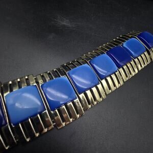 This vintage Charel bracelet features light gold tone panels with blue thermoset squares and measures 1" W x 7" L