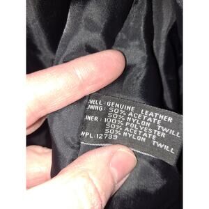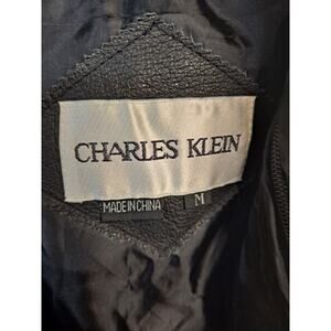 Vintage Charles Klein Black Leather Trench Coat With Belt. There is a removable inset that goes about half way down the body of the coat. There is a button missing on each side of the cuff and the last button on the coat. Please see pictures.