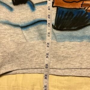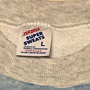 This sweatshirt was (spray) painted by a local artist over 30 years ago. It is a light gray sweatshirt with the design on the front. Some of the paint went through to the back but the spot is negligible. SEE PICS. ALSO SEE PICS FOR MEASUREMENTS AS THIS IS A LARGE THAT RUNS SMALL. This sweatshirt was worn by me once or twice a year for 15 years.