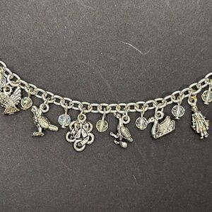 This vintage silver tone charm bracelet features 12 unique charms separated by aurora-style crystal beads.