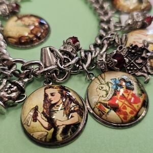 This charming bracelet features a vintage Alice in Wonderland design, perfect for adding a whimsical touch to any outfit. The bracelet showcases intricate silver detailing and vibrant red accents, making it a standout piece. Ideal for fans of classic literature and unique jewelry.