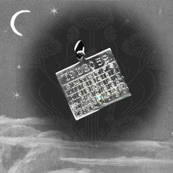 The potential for serendipity here is big. This doesn't take much describing, because it's all in the title, but let's repeat all that anyway. Sterling silver charm bracelet charm dated 12/24/59 with December birthstone (as close as they could get to "turquoise") marking the day. Must have been a Christmas gift for someone OR maybe gift for someone with that date as a birthday? If that particular date has significance for you, THAT would be serendipitous. No flaws but the jump ring doesn't look like sterling silver. Will come in a tiny gift box