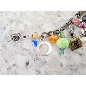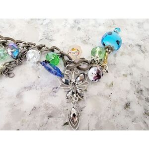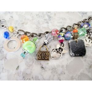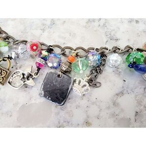 This vintage charm bracelet is a unique addition to any jewelry collection. The bracelet is broken, but the charms can be used on other bracelets. The multicolor charms feature beauty, animals, and have a bohemian and retro theme.