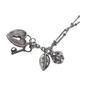 Rhinestone pavé heart lock with keyhole, a small heart skeleton key, a textured leaf charm, and a faceted rhinestone ball. Mixed chain with decorative bead stations and lobster clasp. Adjustable. Flower charm with single rhinestone at the extender