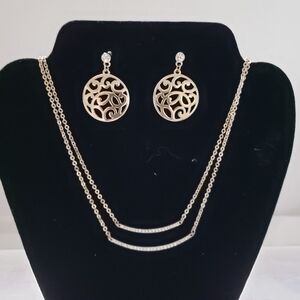 To go along with the necklace is the bonus pair of goldtone filigree type earrings. They are light and beautiful. They are unbranded but I paired them with the necklace before and they look gorgeous. The measure 1 1/4 inches long and 1 inch wide. They are clean and show no signs of wear. They are posts for pieced ears.