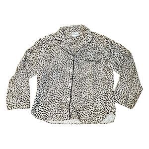 Vintage 80s Charter Club Leopard Print Pajama Set in Ivory with a Tan and Brown Cheetah Printed Pattern. The Sleep Set Shirt features a notch collar buttoned placket, long sleeves and brown satin trim. The Sleep Pants feature straight leg lounge pant with elasticized waist.