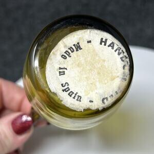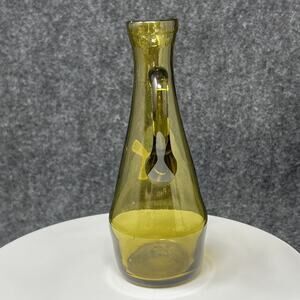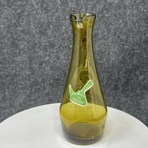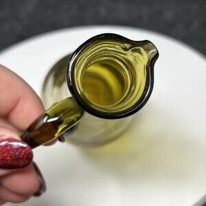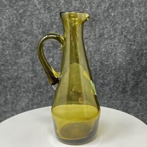 Hand-blown Spanish art glass pitcher in chartreuse/olive, approx. 6" tall with original “Made in Spain” sticker and applied handle.