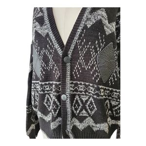 Vintage Chartwell Cardigan Sweater 2X Black Gray Geometric Knit Leather Patches