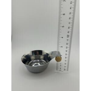The Vintage Chase Brass and Copper Company Art Deco Bakelite Chrome Serving Bowl is a stylish and collectible piece made in the United States. This 4-inch bowl features an elegant Art Deco design with a combination of chrome and Bakelite star insert on the handle, adding a touch of retro charm to any dining or serving set. It was designed by Walter Von Nessen and is model #17059 Perfect for serving snacks or desserts, this vintage bowl is sure to be a conversation starter in any home collection. It measures 1.5" tall, 4" long and 3" wide. The piece is in good, vintage condition. The bakelite handle is in excellent condition. The chrome bowl shows signs of wear. Please examine all the photos. It is an estate piece. It weighs 3.5 ounces.