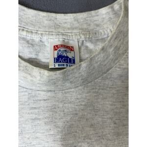 This is a vintage men's T-shirt from American Eagle Outfitters in size Large. It features a design of "Chase This" Eighteen Wins Rusty Wallace 2 Years, with a single stitch construction. The shirt is gray in color and includes the character Stitch. It is a regular fit tee with a unique design inspired by racing culture.