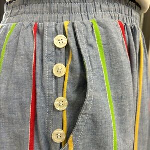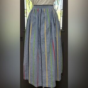 Vintage Chaus Sport Chambray Maxi Midi Skirt Rainbow Stripe Pull on Skirt with pockets and Faux button detail.