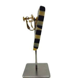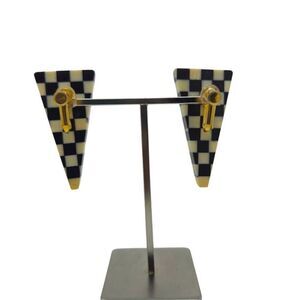 These vintage clip-on earrings feature a bold black and white checkerboard pattern in a triangular shape, giving them a striking, geometric look with a hint of 1980s flair. The earrings come with new screw back cushions and a unique hinge clip design, providing extra comfort and a secure fit. Their high-contrast design makes them an eye-catching accessory, perfect for adding a graphic touch to any outfit.