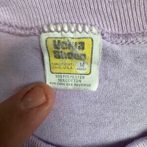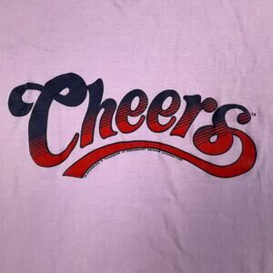 Original 1980s “Cheers” TV show T-shirt on a Velva Sheen tag, made in USA. Soft lavender purple with bold red/black graphic. Classic 50/50 cotton-poly blend with single stitch sleeves and hem. Faded with a soft vintage drape. Minor pinpoint mark on one sleeve, otherwise in great vintage condition. Tagged Medium.