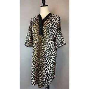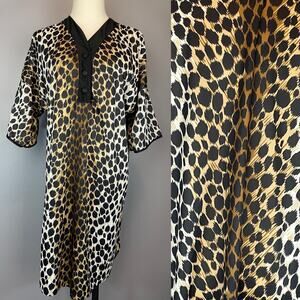 Vintage Cheetah print kaftan nightgown with black trim and button detail at the neckline.