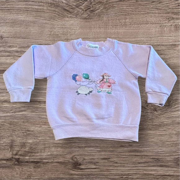 Vintage children's sweatshirt by Cheetah by Mervyn's in a soft lavender color featuring a charming cross-stitch–style embroidered design with a girl, sheep, and balloons. A whimsical motif typical of late 1980s–1990s children's apparel.