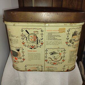This bread box has classic recipes and food drawings on all four sides. It is a nice collectible from the 1960's.