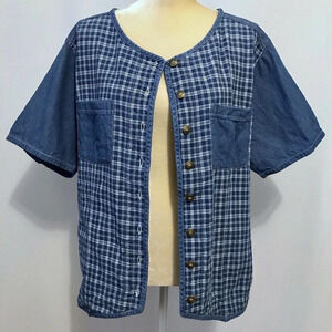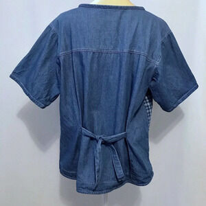 Excellent condition. Short Sleeves Button Down Jean Shirt for Women Size 18W. 2 chest pockets, antique gold buttons for closure front, gingham design front, ties on the back at waist, please see pic for bottom hem style. Necklace not included. Pictures are part of description.