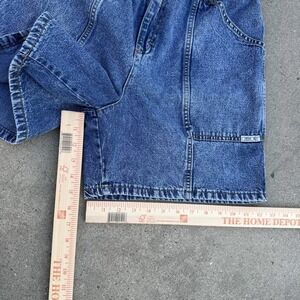 The product is a pair of vintage Cherokee Mom Jean Shorts in high waist style, size 10. These denim shorts are from the 1990s and have an elastic waist for a comfortable fit. Made in the USA, they feature a grunge look in a classic blue color. Perfect for a casual occasion, these original shorts have that retro feel and are a unique addition to any wardrobe.