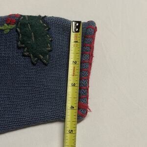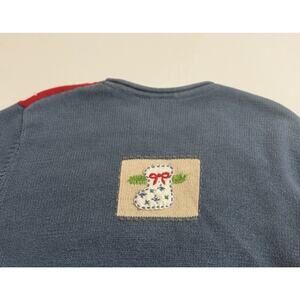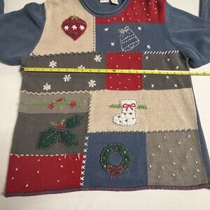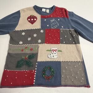 This Vintage Cherokee Winter Holiday Christmas Patchwork Sweater in XL is a colorful and festive addition to your winter wardrobe. Main color blue. Multiple color front with different embroidered Christmas patches. Has light stain on sleeve. No rips.