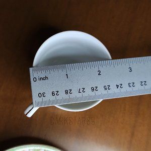Cup measures about 2" in height, 2.5" in diameter. Saucer measures about 4.5" in diameter.