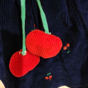 Vintage Cherry Corduroy Coverall Style Dress. back zipper closure. meant to be work over a shirt. one of the cherries hanging had to be sewn back on and they both have some dark areas and one cherry has some seam ripping