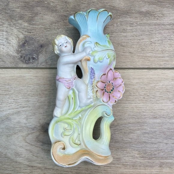 Absolutely stunning cherub child figural hand painted porcelain decorative Victorian? stem vase. The body of the vase features leaves and flowers in green pink purple and blue with gold accents. Stamped on the bottom but it is not decipherable. A beautiful feminine accent piece perfect for romantic bohemian and cottagecore Fairycore design. One very small chip on the back bottom as pictured, overall excellent condition.