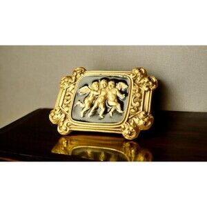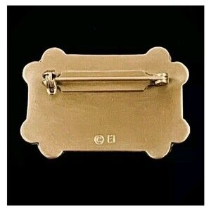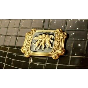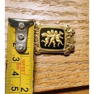- This beautiful vintage brooch is a stunning piece of jewelry that will make a wonderful addition to any collection. The intricate design features cherubs and angels in a black and gold color scheme, with a striking square shape measuring 1.3 inches in length. The brooch is signed by EI and comes with a seller warranty for added peace of mind
