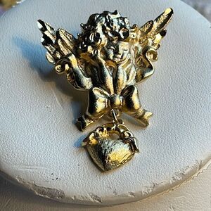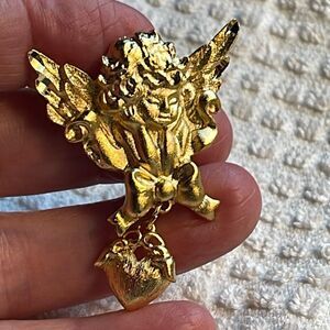 Vintage Cherub with dangle heart brooch USA stamped . Almost 2” long. Gold colored metal.