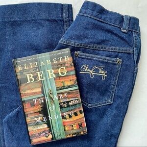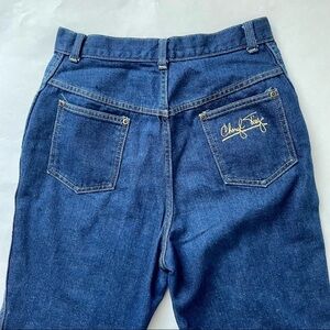 Medium to dark wash denim vintage straight leg jeans by American model and fashion designer Cheryl Tiegs.