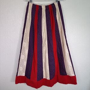 vintage chessa davis skirt womens medium patchwork quilted lace red blue white folk boho americana usa elastic waistband retro prairie 70s