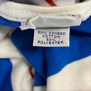 Patriotic red, white and blue stripes on 50% combed cotton/50% polyester top. Made in USA.