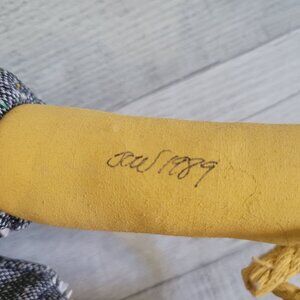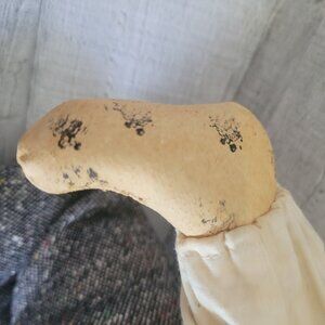 This unique vintage chicken doll is crafted with care, showcasing a charming folk art design. Adorned in overalls and a bowtie, it adds a whimsical touch to any collection or display.