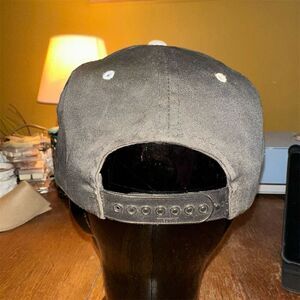 Keywords: Vintage snapback, black hat, embroidered logo, automotive theme, unisex adults, adjustable closure, casual wear, cotton polyester, rope brim, pre-owned.