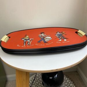 vintage serving trays, Chianti trays, mid-century barware, retro kitchenware, British Royal Guards decor, London guards, British pub decor, man cave wall art, MCM bar cart display, parade military art, collectible melamine trays, 1960s serving tray set, retro entertaining, tea serving tray, vintage wall hanging, UK royal memorabilia