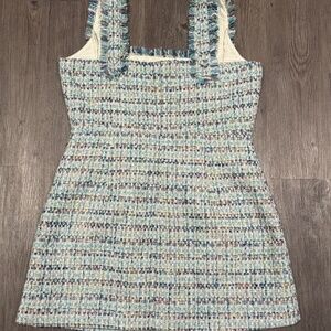 Chic pastel tweed mini dress featuring gold-accented buttons and fringed trim details