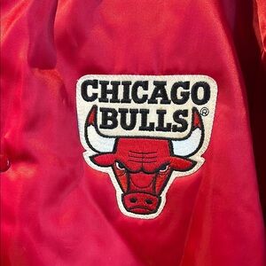 Stylish red satin jacket with Chicago Bulls logo. Features striped cuffs and collar. Perfect for fans.