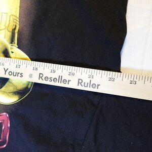 Classic black shirt with bold multi-color print. Large Chicago Bulls team and NBA branding