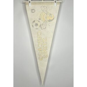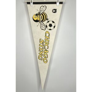 A vintage Chicago Sting NASL 30x12 full size soccer pennant from the 1970s. Pennant is in very good condition. Colors are bright and the fabric is crisp. Stitching at top intact. Point sharp with very small wrinkles. One small spot on the top edge above the O in Chicago. No pinholes. Stored stacked and flat. Shipped lightly rolled in large box. Please see photos for complete description.