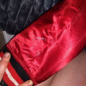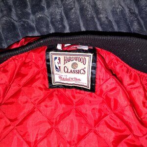 Mitchell and Ness vintage Chicago bulls hardwood classics jacket, in very good condition minus the very small paint splatter on the back of the right sleeve , shown in picture .