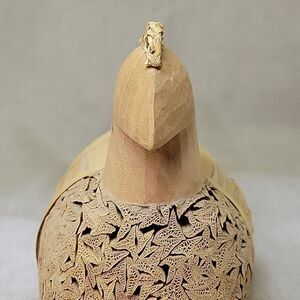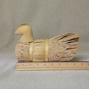 A nice variety of chicken/rooster items. There is a Vintage Corn Husk, Reed chicken with wooden head. It measures approximately 9.5 inch long x 6 inch high. A chicken shaped pot holder, and fried egg napkins. A cute checkered towel - 26" X 19", Also included is a couple cute homemade chicken magnet, a metal rooster magnet, and a plaster of paris wall piece, Lovely quilted runner - 66" Long X 13.5" W. reversible from stripes to roosters & roses. An awesome package for a chicken or rooster collector.
