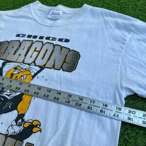 ☆ Features: White long-sleeve t-shirt with bold "Chico Dragons Basketball" graphics on the front, featuring a fierce dragon mascot in action. The back reads "Feel the Flame" with a flaming basketball graphic. Perfect for basketball fans and vintage sportswear enthusiasts.