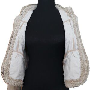 Chico's vintage jacket in excellent condition without holes or stains. Jacket has natural light distressing , sturdy latch hook closure from top to bottom, detailed button wrist cuffs, and four front pockets.