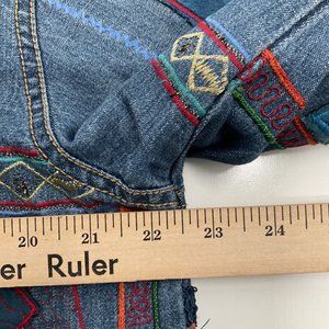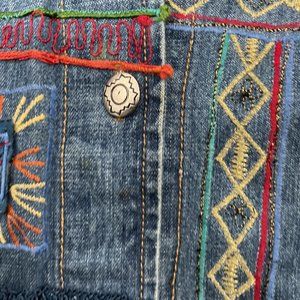 This jacket is a must-have for any woman who loves vintage clothing. It is perfect for the winter, summer, fall, or spring seasons and will keep you looking stylish all year round. The jacket is also easy to care for, as it is dry clean only. Made in India, this jacket is unique fun and will stand out. Beautiful Jean Jacket with embroidered Art by Chico's Design.