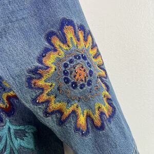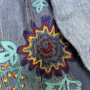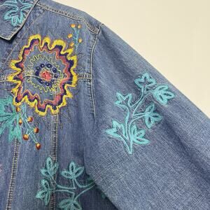 Vintage Chico's Denim Shirt Jacket Floral Embroidery Button Up Beaded Size XL