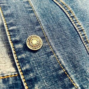 Striking vintage Chico’s Design vest with beautifully embellished front panels. This denim vest features metallic beadwork in silver and gold tones, adding standout texture and interest to a classic silhouette. A collectible piece with Western flair and high-end craftsmanship.