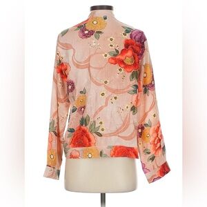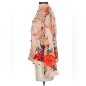 Beautiful and unique vintage Chico’s Design blouse crafted from 100% silk in a rose-colored base with an intricate multicolor floral pattern. This cheongsam-inspired top features a mandarin collar, full front frog closures, and elegant long sleeves with button cuffs. The luxurious silk fabric drapes beautifully, making it perfect for special occasions, resort wear, or adding a touch of vintage sophistication to your everyday wardrobe.